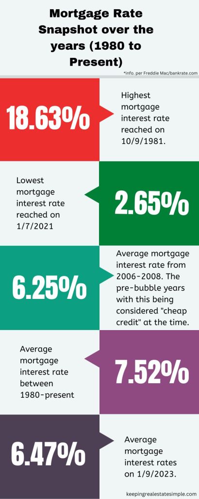 Looking at these numbers side by side, it is obvious that the 2.65% in January of 2021 was great, and even the 3 and 4%’s of early 2022 were awesome as well, and I know 6.47% feels like a HUGE problem, but when you take it all into context with history, that 6.47% is still a deal compared to the average loan rate. So if you are looking to buy, you should feel good that you will still get lower than average rate.